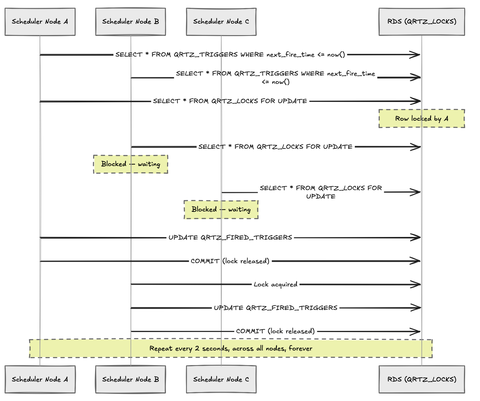 Three databases. Same problem each time. That's when it became clear the database was never the issue. Quartz's coordination model was the issue, and no amount of engine-swapping was going to change that. SELECT ... FOR UPDATEon a hot lock row is SELECT ... FOR UPDATE on a hot lock row whether it's MySQL, Postgres, or Aurora underneath. Quartz is well-suited for daily cron jobs, report generation, small batch workloads on a single node. The JDBC cluster mode is designed for failover, not for high-throughput coordination. When you treat the database as a distributed lock manager under real load, you're going to find its limits. SELECT ... FOR UPDATE across multiple competing processes doesn't scale the way you'd hope.